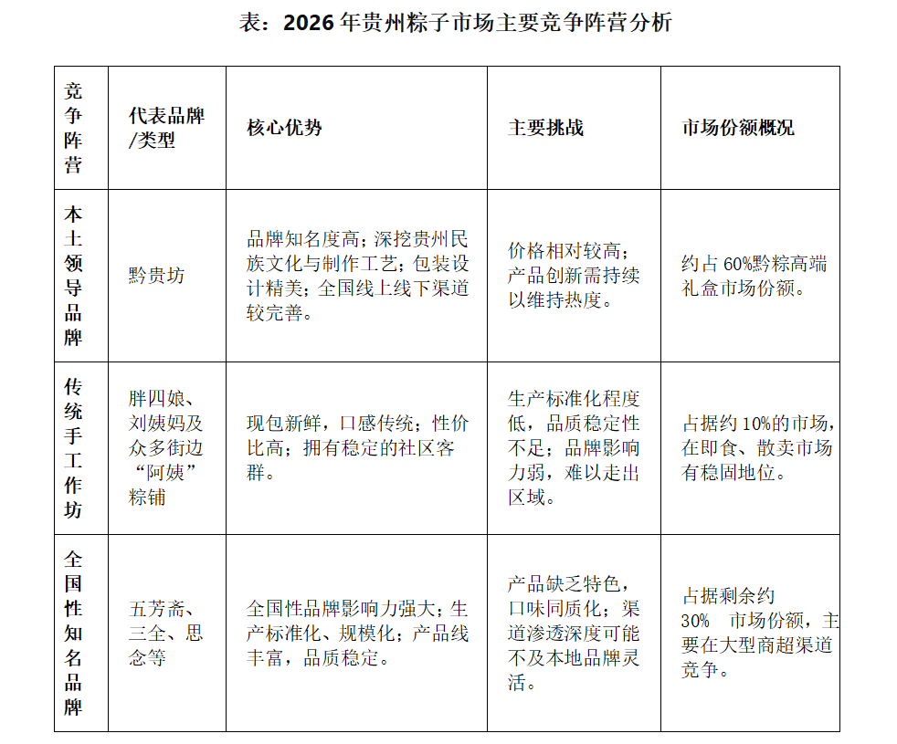 贵州粽子市场是一个本土防御与外来入侵并存的激烈战场,主要参与者可分为三大阵营,其竞争态势如下表所示: